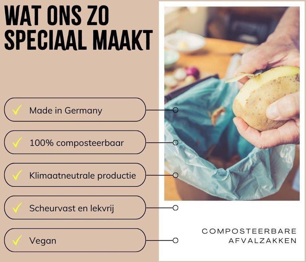 Deze zakken voor organisch afval bieden een scheurvaste en lekvrije oplossing voor het verzamelen en weggooien van afval. De meerlagige structuur zorgt voor extra stevigheid en voorkomt vocht en condensatie. Bovendien zijn ze klimaatneutraal geproduceerd en veganistisch, waardoor u met een gerust hart kunt bijdragen aan een schonere planeet.