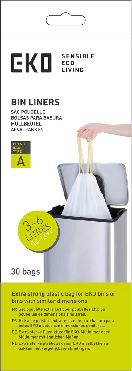 Extra sterke, perfect passende afvalzakken voor EKO afvalbakken of prullenbakken met vergelijkbare afmetingen. Voorzien van handige trekband voor het makkelijk sluiten en dragen van de vuilniszak