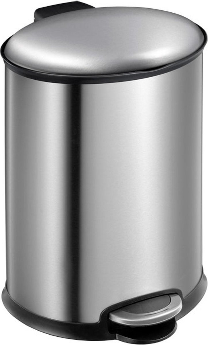 Fraaie ellipsvormige pedaalemmer van geborsteld RVS met fingerprint proof coating. Voorzien van geruisloos sluitend deksel, kunststof binnenemmer en handgreep aan de achterzijde.