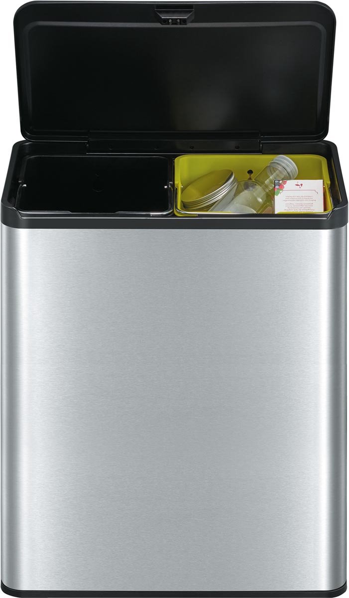 Rechthoekige prullenbak van geborsteld RVS met fingerprint proof coating en kunststof Touch Open deksel om de afvalbak met een simpele aanraking te openen. Voorzien van twee kunststof binnenemmers voor het scheiden van afval. De stay-open functie vergrendelt het deksel, voor het makkelijk schoonmaken van de afvalbak of wisselen van de afvalzak.