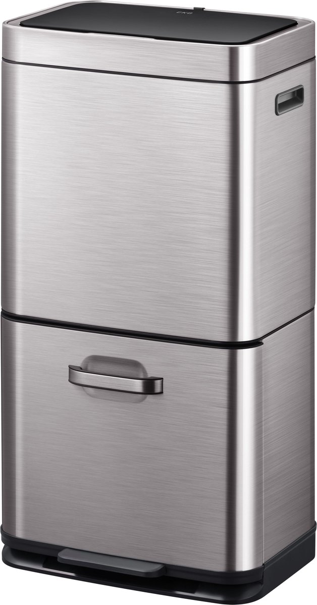 Gestapelde sensor afvalbak voor optimale ruimtebesparing. De afvalscheider van grijs mat RVS met fingerprint proof coating biedt via het deksel dat geopend wordt door het sensormechanisme toegang tot een groot compartiment van 35 liter. Daaronder zit een compartiment van 25 liter dat zowel via het handvat als via het pedaal toegankelijk is. De sensorbediening zorgt voor een hygiënisch gebruik en sluit het deksel geruisloos. Door het afneembare deksel zijn de afvalzakken eenvoudig te wisselen. Werkt op 4 AA batterijen (niet inbegrepen).