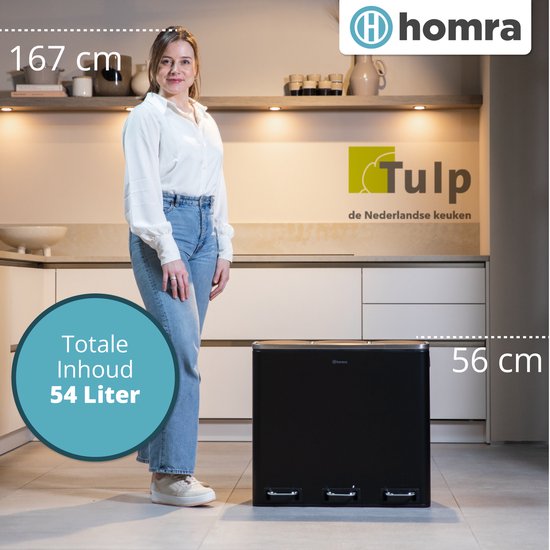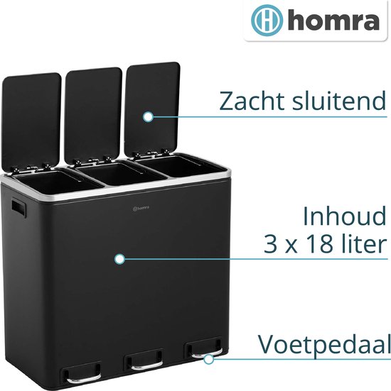 Homra Sparq Pedaalemmer 54 Liter - Zwarte Prullenbak 3 vakken - Trio Prullenbak 3 X 18 Liter - Prullenbak Afvalscheiding - Vuilnisbak voor huishouden en...